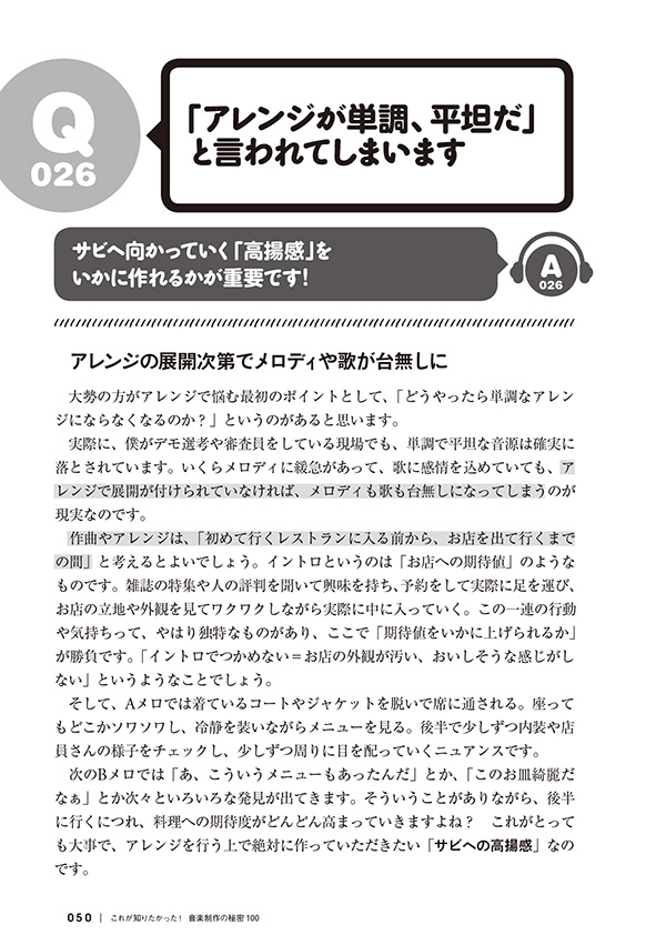 本文中の島崎さんの言葉をそのまま借りると「いくらメロディに緩急があって、歌に感情を込めていても、アレンジで展開が付けられていなければ、メロディも歌も台無し」です。