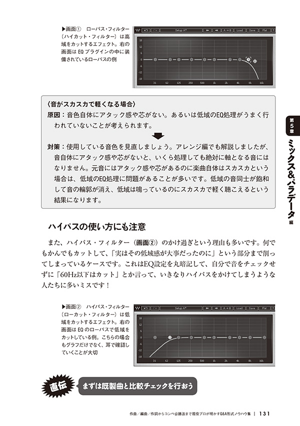 それぞれ本文中に対応策も提示されていますので、まずは客観的に既成曲とミックスの比較チェックを行い、気になる部分を調整していくようにしましょう。