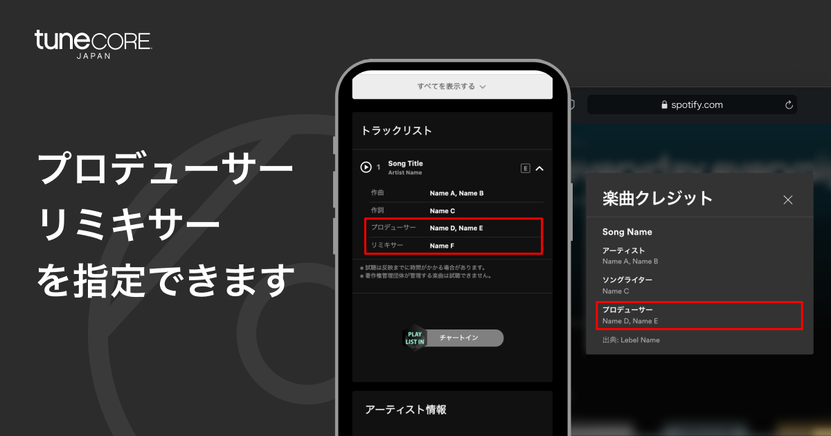 リリース登録時に役割「プロデューサー」、「リミキサー」が指定できるようになりました。 今回のアップデートでは楽曲情報に「役割」欄を新設し、著作者(作詞者・作曲者)に加え、プロデューサーやリミキサーとして楽曲制作に関わった関係者を指定…