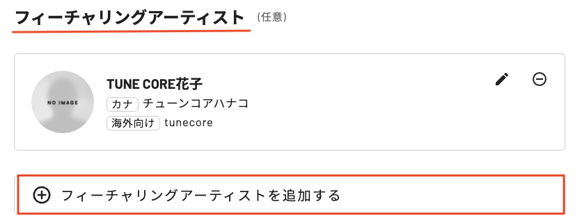 楽曲情報編集画面の「フィーチャリングアーティスト」の項目に、ゲスト参加したアーティスト名を追加します。実際の配信ストア上での表記は以下のようになります。
