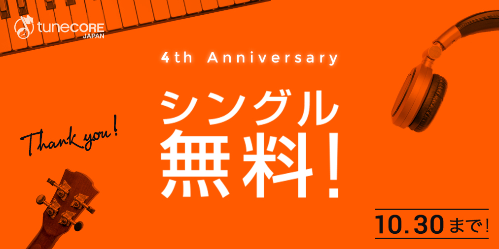 音楽配信流通サービス『TuneCore Japan』は、日本でのサービス開始より4週年を記念し、シングル配信が無料になる4周年記念キャンペーンを2016年10月21日(金)より開催いたします。