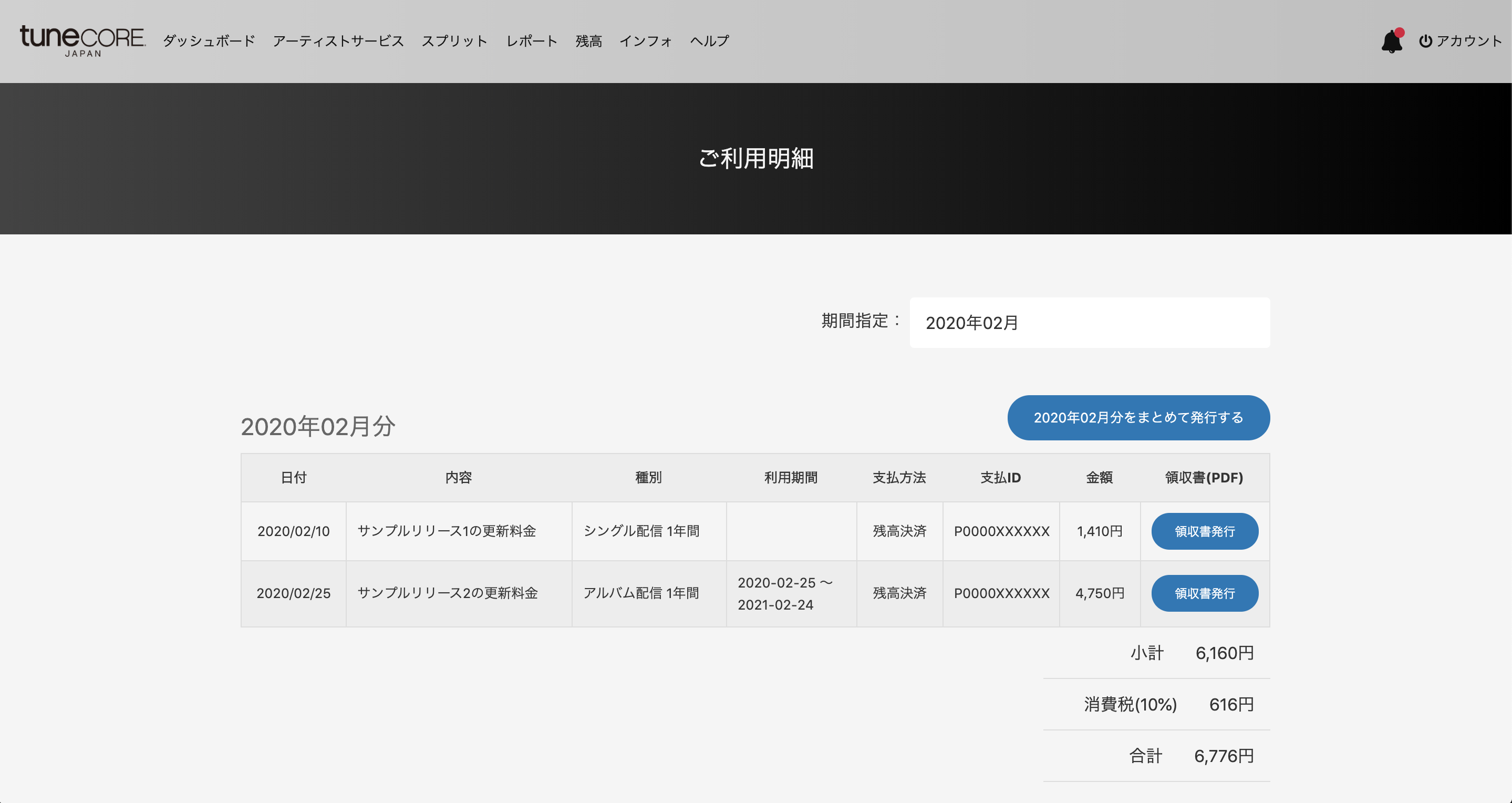 - 各決済単位で利用明細(領収書)をPDFで発行