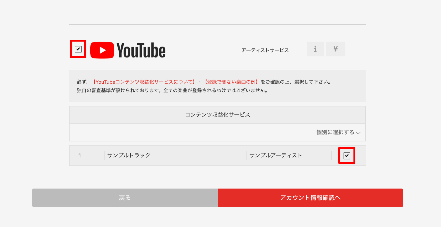 STEP2 ストア選択 にて一括配信ストア選択の設定を行うと、自動的に YouTube コンテンツ収益化サービス が選択されます。登録を希望しない場合はチェックを除外してください。またYouTube コンテンツ収益化サービスの登録対象ではない楽曲が含まれている場合、審査結果時にメールおよびアカウントへのメッセージで通知されます。