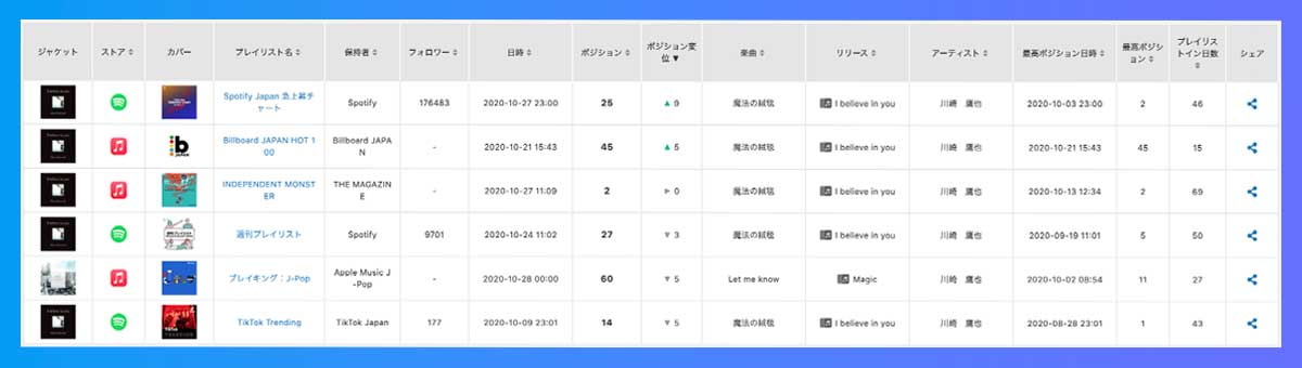 今回提供開始した「チャートイン通知機能」では、TuneCore Japan から配信されている楽曲であれば、ランキングやプレイリストに入った場合、TuneCore Japanの自身の管理画面においてすばやく知ることができます。今回の機能スタート時においては、iTunes Store、Apple Music、Spotify、LINE MUSIC、Deezer、KKBOXの各ストアにおけるランキングイン/プレイリストインに対応。まずは、オフィシャルなものやフォロワー数を多く抱えているといった主要なランキングやプレイリストに関する情報から提供し、今後もその取得範囲を拡大していく可能性があります。「チャートイン通知機能」では下記のデータ、情報のチェックが可能となっています。