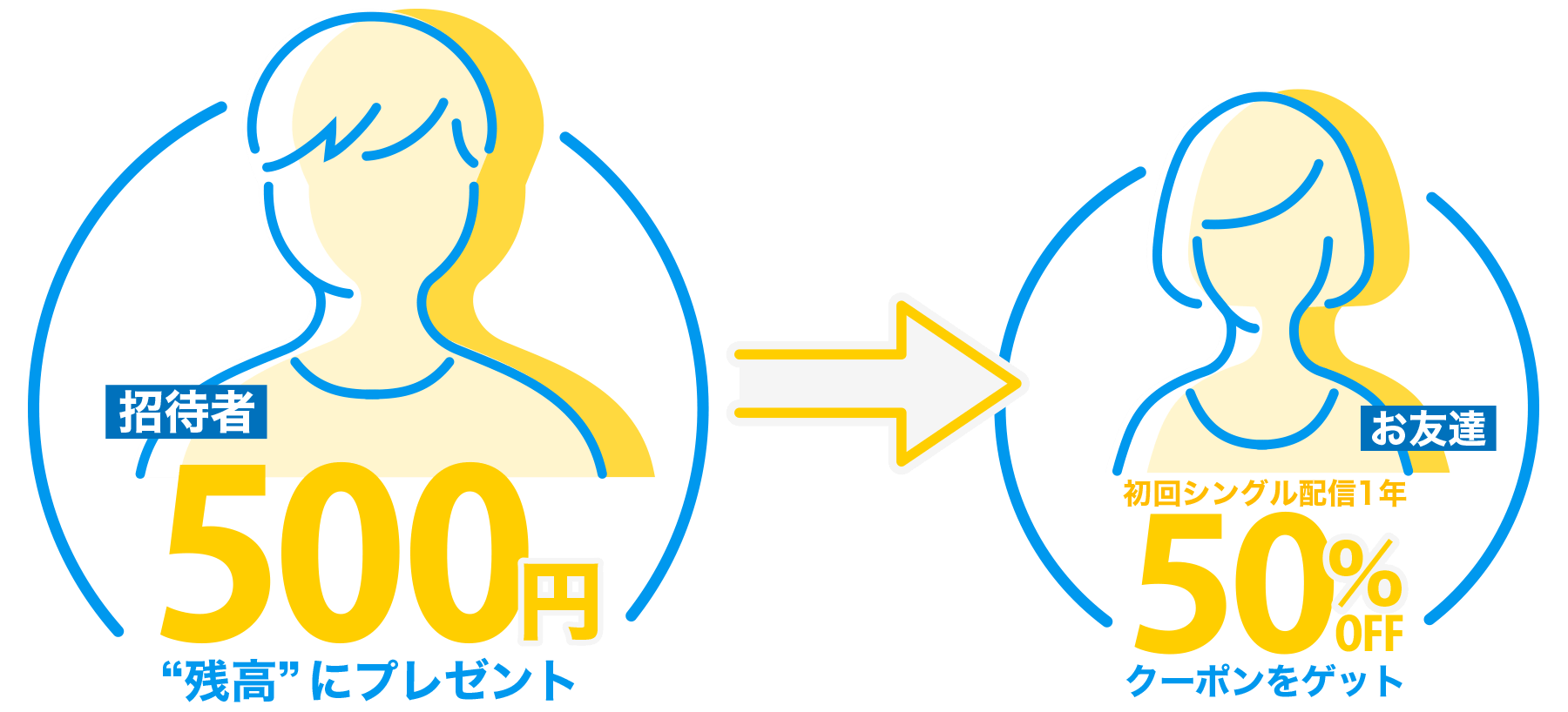 お友達が TuneCore Japan にアカウント登録し、楽曲を配信開始した時点で、ご招待いただいた方には500円を ”残高” にプレゼント!そのお友達には 初回のシングル配信1年が50%OFFになるクーポン を差し上げます。