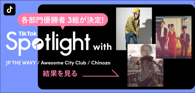 TikTokによる新たな才能を応援する音楽プロジェクト「TikTok Spotlight with JP THE WAVY・Awesome City Club・Chinozo」の各部門優勝アーティストが発表されました。