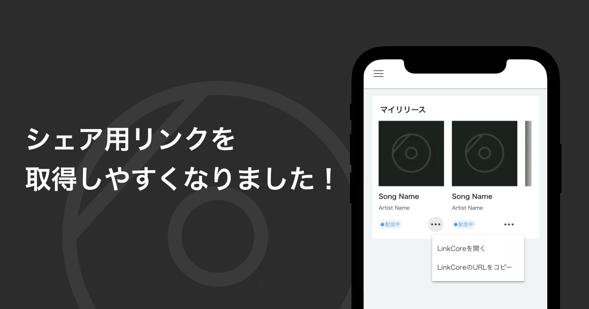 今回はアーティストのみなさんが日々音楽活動をする中で、リリース楽曲やアーティストプロフィールの共有を行うことでファンとのコミュニケーションを促進できる LinkCoreとアーティストページのリンクをダッシュボードTOPページから取得しやすくする というカイゼンを行いましたのでお知らせいたします。