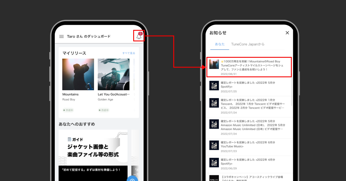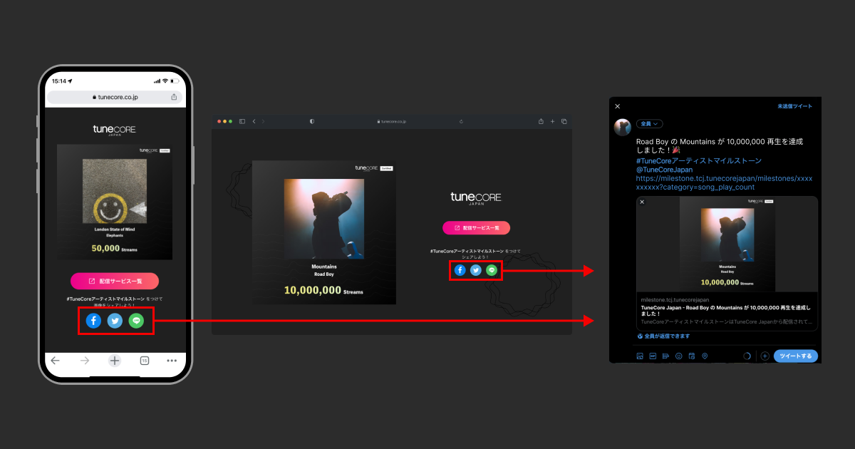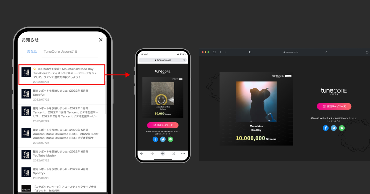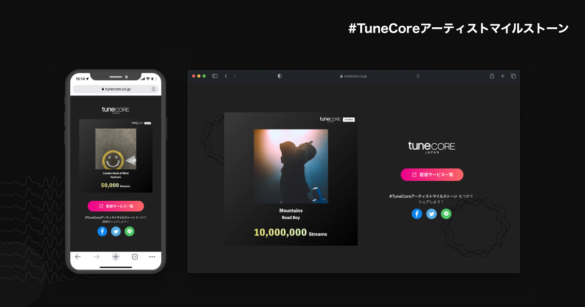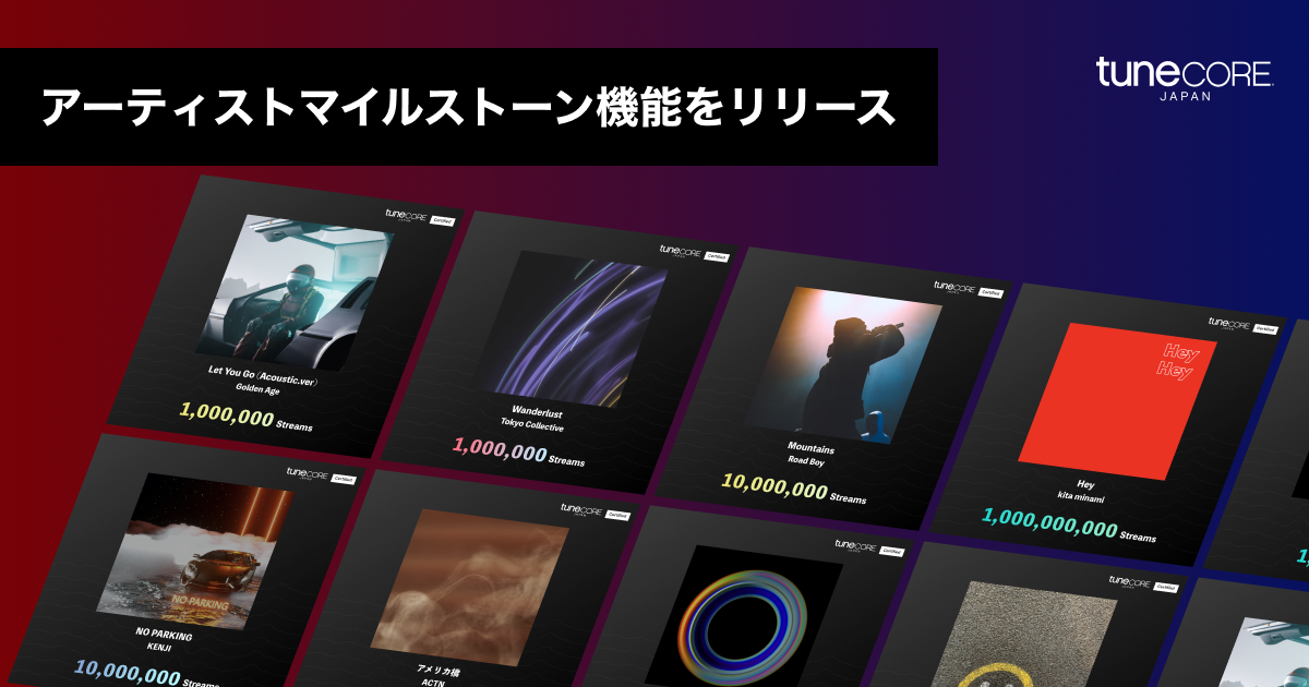 #TuneCoreアーティストマイルストーン @TuneCoreJapan のタグを付けてシェアすることでSNS上でお祝いを盛り上げることも。 ぜひタグをつけて節目のお祝いをファンや新しいリスナーにシェアして盛り上げましょう!