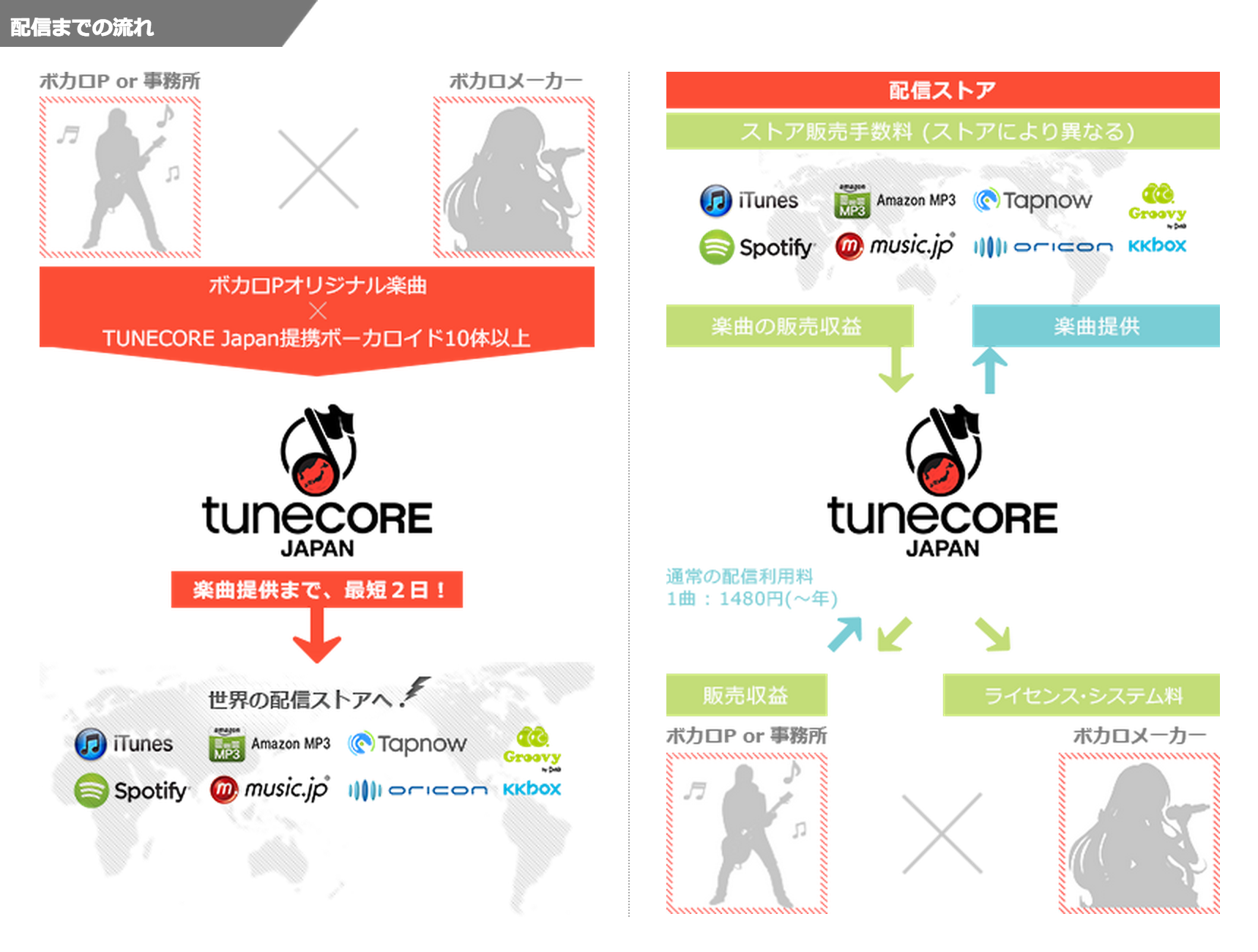 従来であれば、VOCALOID™を利用した楽曲を販売(商用利用)するには、ボーカロイドメーカー各社の許諾を個別に取る必要があったのですが、TUNECORE JAPANを利用しているアーティストに限っては、その必要がなくなります。現在、賛同して頂き提携して頂いたのは、株式会社インターネット、エグジットチューンズ株式会社、株式会社AHS、株式会社サーファーズパラダイス、株式会社HEARTFAST、1st PLACE株式会社の計6社!ありがとうございます♪今後はさらに、増やして行きたいと思います!