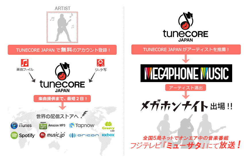 TUNECORE JAPANが『MEGAPHONE MUSIC presents メガホンナイト』に出場枠を設け、TUNECORE JAPANより楽曲配信をした利用者の中から、アーティストを推薦、選出し、実際に『メガホンミュージックメガホンナイト』でライブが出来るという取り組み。更に、その模様はテレビとも連動しており、フジテレビで全国5局ネットにてオンエア中の音楽情報番組『ミューサタ』番組内でも紹介していきます!!