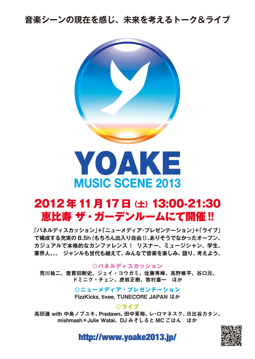 新しい段階に差しかかっている音楽シーンの現在と未来をトークとライブを通して感じ、考えるイベント「YOAKE ~ Music Scene 2013~」 にちょこっと参加させてもらいます!11/17(土)恵比寿 ザ・ガーデンルームで、15時半からの20分程度です!楽曲の設定方法と海外事例などを話たいと思いますので、お時間があれば是非お越しください!